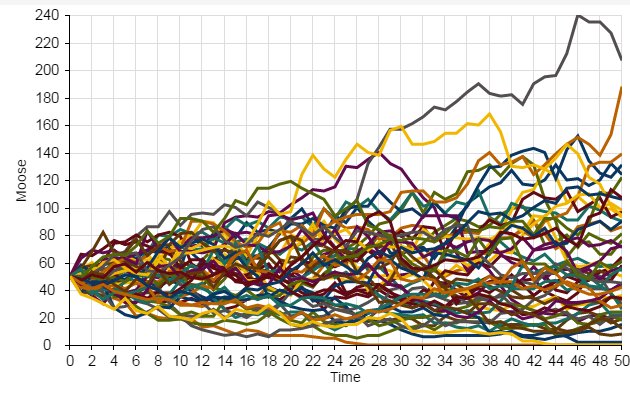 - Use the “Sensitivity Testing” tool (in the “Tools” menu, upper right corner) to run the model 100 times. Choose your [Population] (Moose) as the “Monitored Primitive”. View the results!