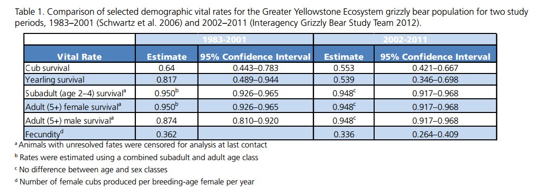 - All parameters aside from yearling survival should be the same between the two scenarios (so that the presence/absence of the density-dependence process is the only difference between the scenarios). I suggest you use all parameters estimated for the period 2002 to 2011, just to be consistent!