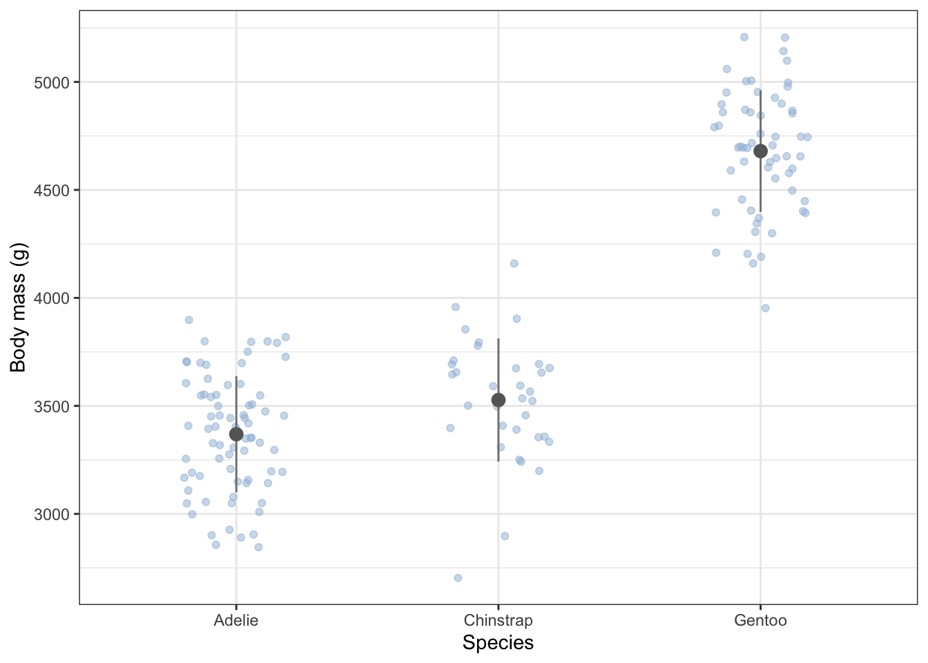 Note that we have only been told, so far, about the magnitude and significance of differences between all the levels and the reference level. We are not told the significance of any difference between any other pair of levels. So in particular, the ANOVA does not tell us whether there is a significant difference between the masses of Chinstrap and Gentoo females (although we may have a good idea what the answer is, from our initial summary table and plot).