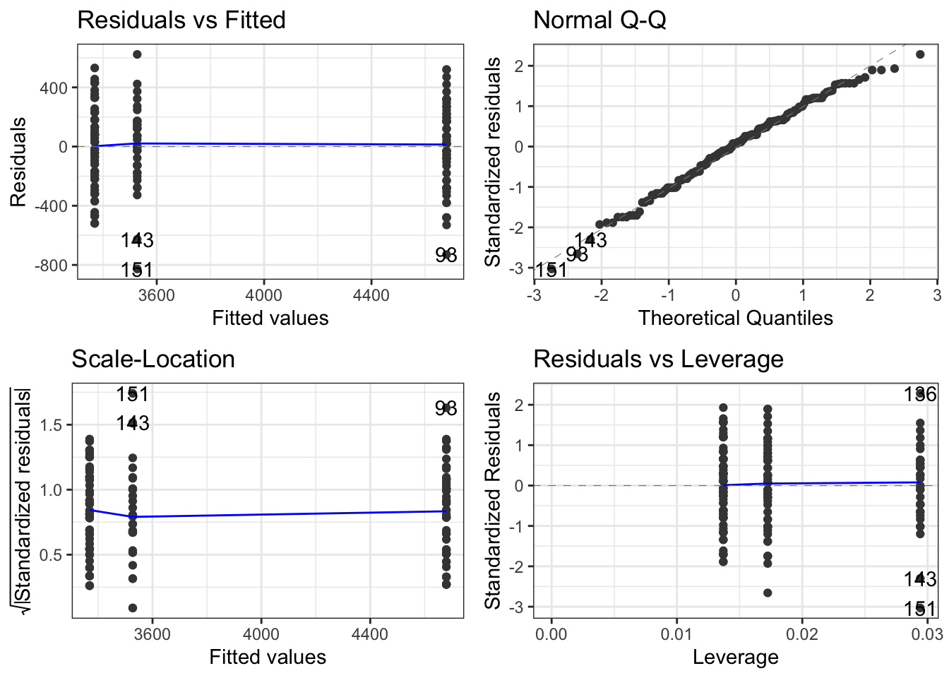 There are various ways we can find out whether these conditions are met. A useful one is to do it graphically, and a handy way to do that is to use the autoplot() function from the ggfortify package. Let’s do it: