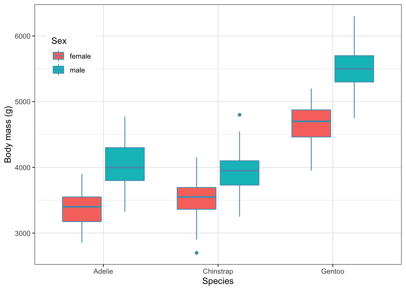 Thus, we are being told that Chinstrap females in the sample have a mean body mass that is 158.37 g heavier than that of Adelie females, so that their mean body mass is 3368.84 + 158.37 = 3527.27g. Again, cross check that with your summary table and the box plot. Is it right?