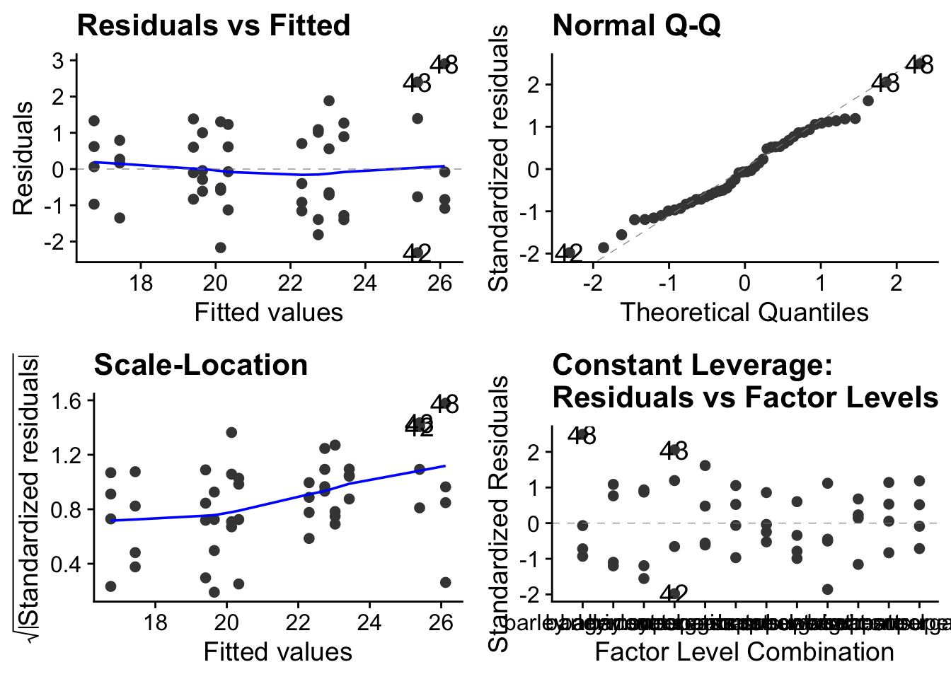 Well, that all looks fine. In particular, from the top-left figure we see that the variance of the residuals is more or less constant and from the top-right figure, the quantile-quantile plot, we get a pretty good approximation of a straight line which tells us that the residuals are more or less normally distributed. These are two key assumptions that must be at least approximately satisfied by data if it is going to make any sense to use a linear model to analyse it. We won’t discuss here the other two diagnostic plots, but they look fine too. So we are good to go using ANOVA with this data.