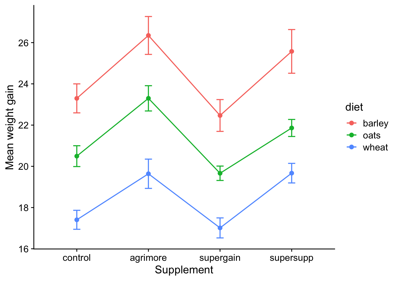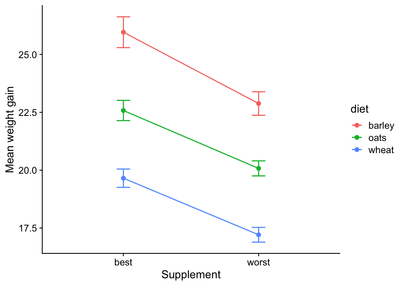 From this we can see that diet clearly makes a difference to weight gain, since the three lines are separated by a distance much larger than the standard errors, and also that the best supplement clearly makes a difference since there is a consistent drop on going from ‘best’ to ‘worst’, again by an amount that is much larger than the error bars, and there is clearly no interaction between diet and supplement, since the lines are parallel within the wiggle-room allowed by the error bars, which means that the effect of diet does not depend on supplement, and the effect of supplement does not depend on diet.