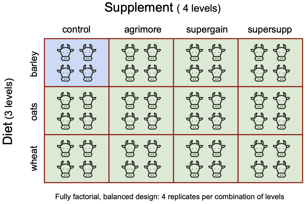 We take an example from a farm-trial of animal diets. There are two factors: diet and supplement. diet is a factor with three levels: barley, oats and wheat, where barley is the diet that has always been used and the other two are potential alternatives. The purpose of the trial is to see if their use makes a difference to growth outcomes. supplement is a factor with four levels: control, agrimore, supergain and supersupp, where control could mean the absence of any supplement or the supplement used up to now, whose effects we are hoping to improve upon through use of one of the others included in the trial. The response variable gain is weight gain after 6 weeks. There were 48 individual cows in total with 4 for each combination of diet and supplement. Having the same number of replicates for each combination of levels means that this is a balanced design.