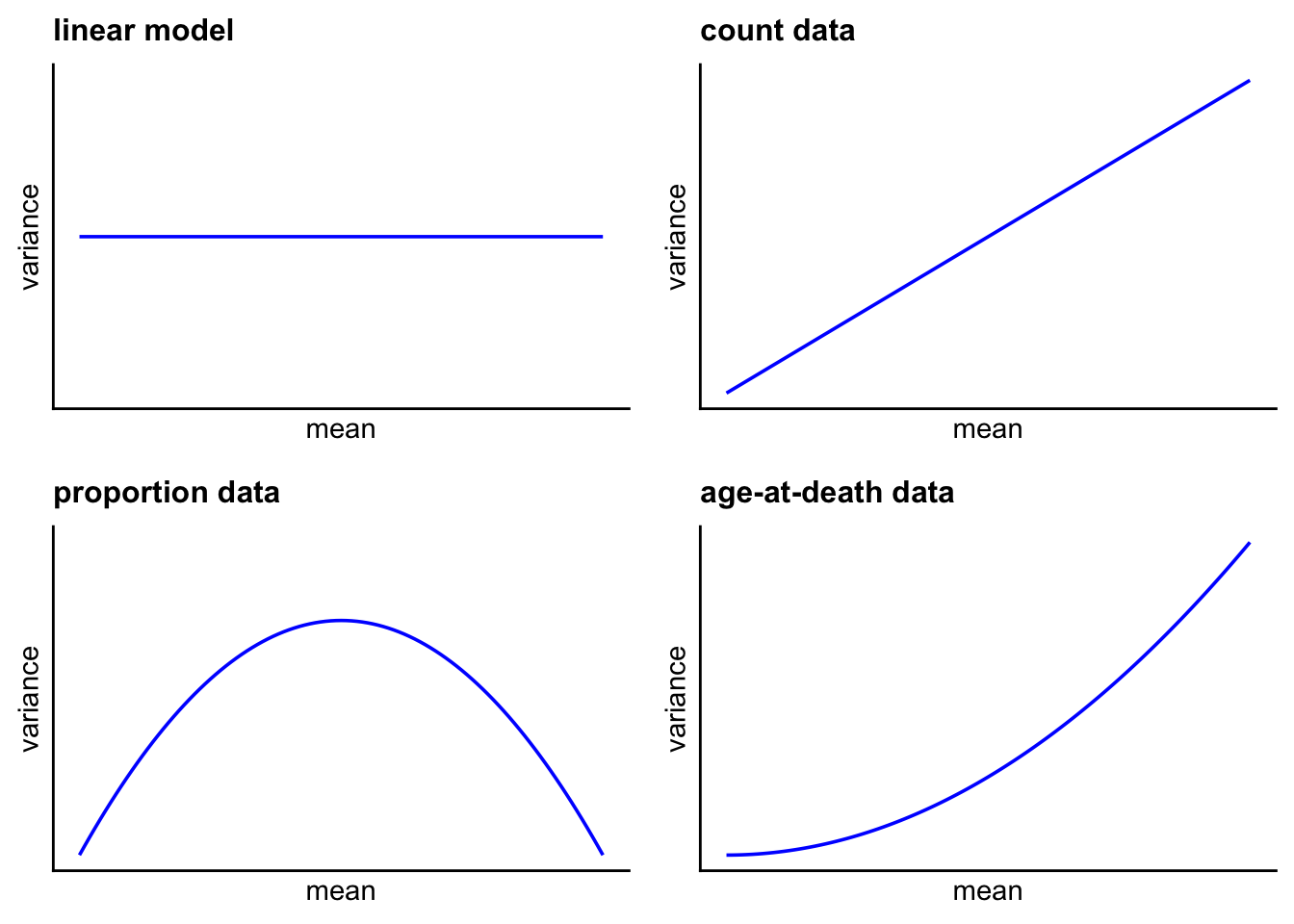 Hence, unlike count data where the variance increases monotonically with the mean count, with proportion data the variance is a humped function of the mean. For this reason, proportion data is often analysed using the Binomial distribution. If p is the probability of a success and (1-p) is the probability of a failure, the mean number of successes is np and the variance of this number of success is np(1-p). Hence this variance will be zero if p = 0 or if p = 1, and is maximised if p = 0.5.