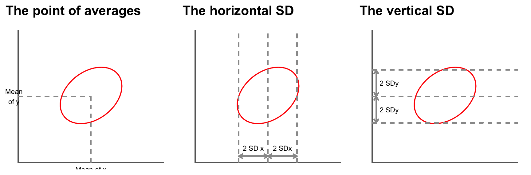 The next step is to measure the width of the cloud from side to side, in both the x and the y directions. This can be done using the standard deviations (SD) of the x and y values. Remember that if both x and y are normally distributed, then 95% of the data will lie within about 2 (1.96 if we want to be pernickety) standard deviations of the mean, in each direction.