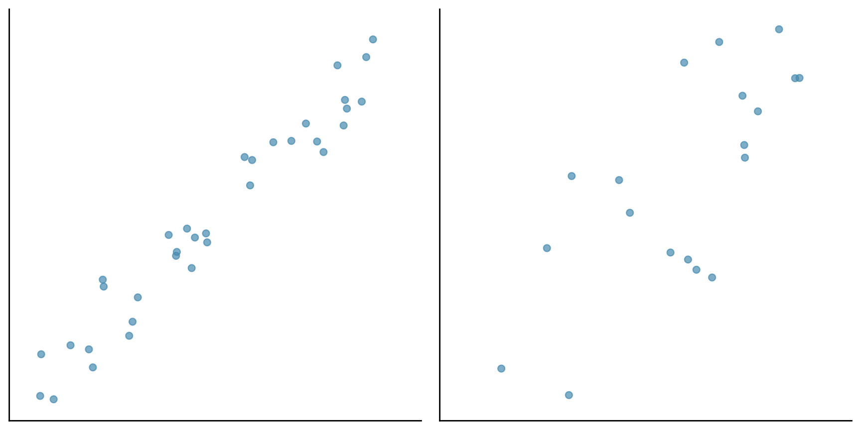 However the points in the first cloud are tightly clustered around a line - there is a strong linear association between the two variables. In the second cloud, the clustering is much looser. The strength of the association is different in the two diagrams. To measure the association, one more summary statistic is needed - the correlation coefficient.