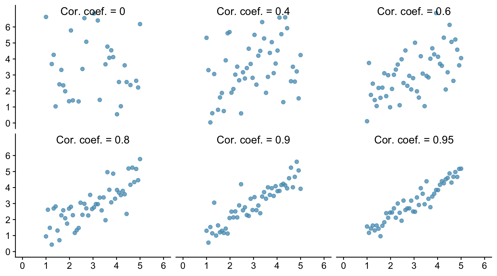 Let us see how this looks graphically. In the Figure below we show six scatter plots for hypothetical data. In all six pictures the average is 3 and the standard deviation is 1 for both x and y. The correlation coefficient is printed in each case.
