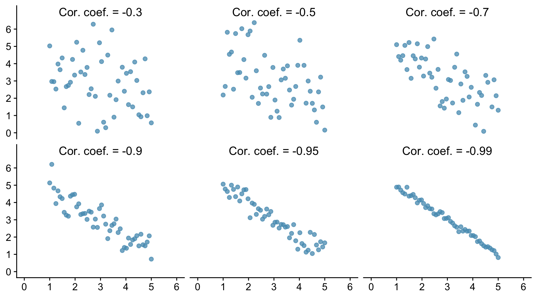 Below we show six examples of negative correlation. As in the previous figure, all the data sets have a mean of 3 and a standard deviation of 1.