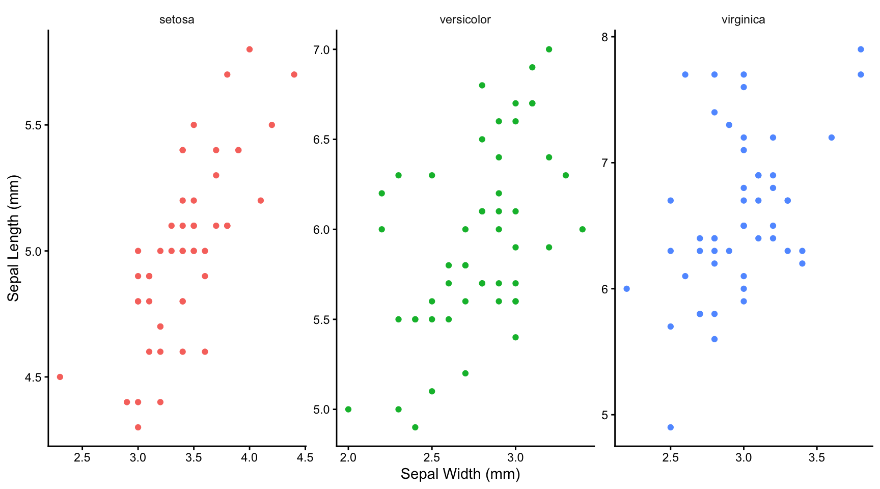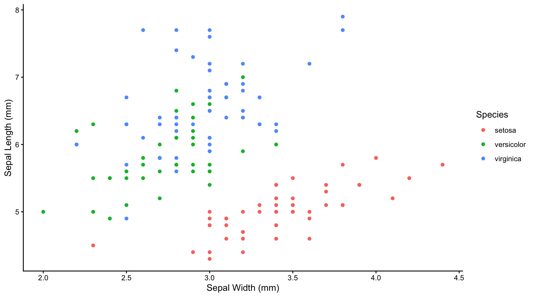 ggplot(aes(x = Sepal.Width, y = Sepal.Length, colour = Species)) +