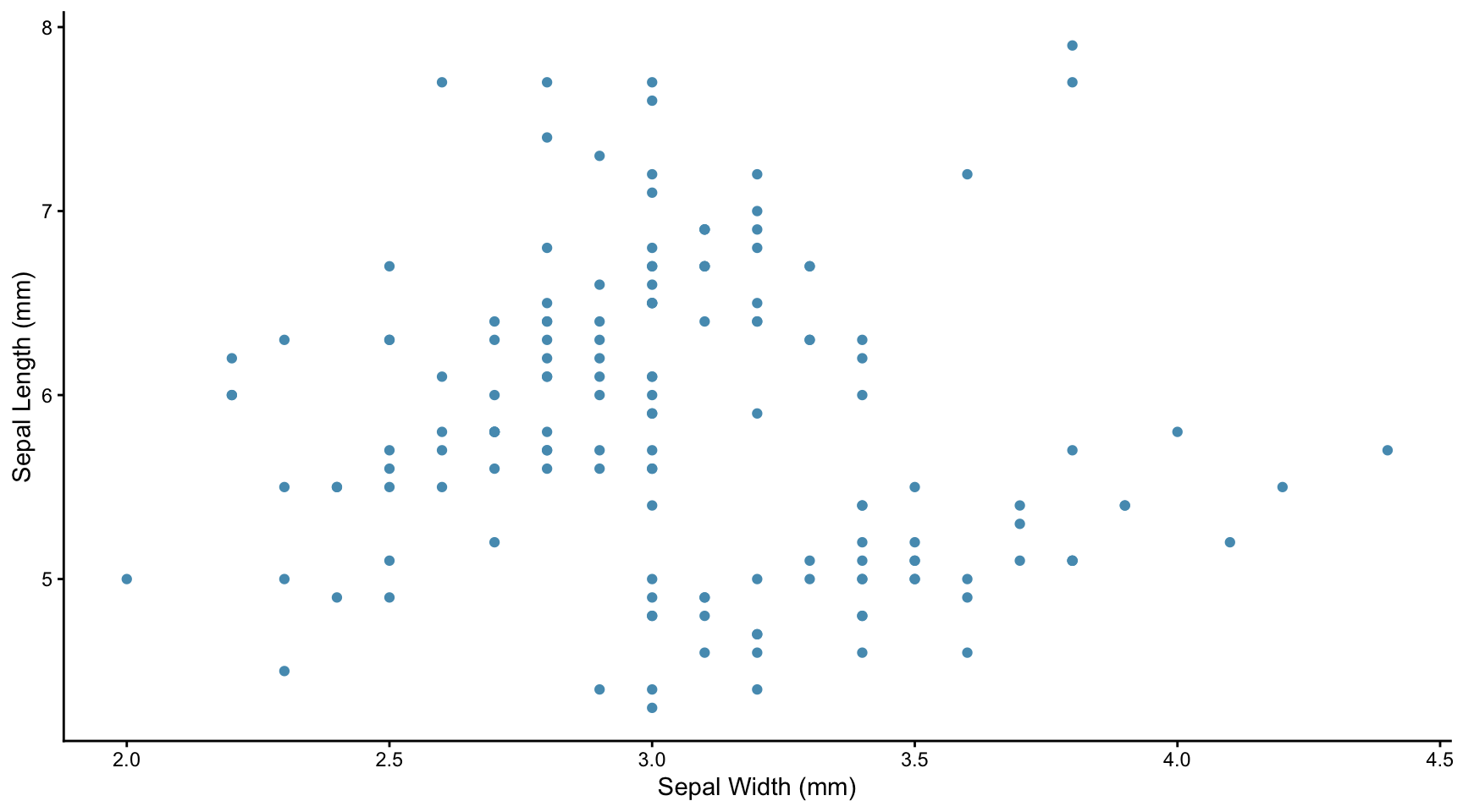 Having seen the plots, do you think it plausible that there is a linear relationship between sepal width and length? Only in this case can you use a Pearson correlation test (see below). If not linear, do you think there is at least a monotonic relationship between petal width and length (ie no peaks or troughs)? That, at least, would enable you to use a Spearman’s Rank correlation test. If neither are true, then you can’t use either test.