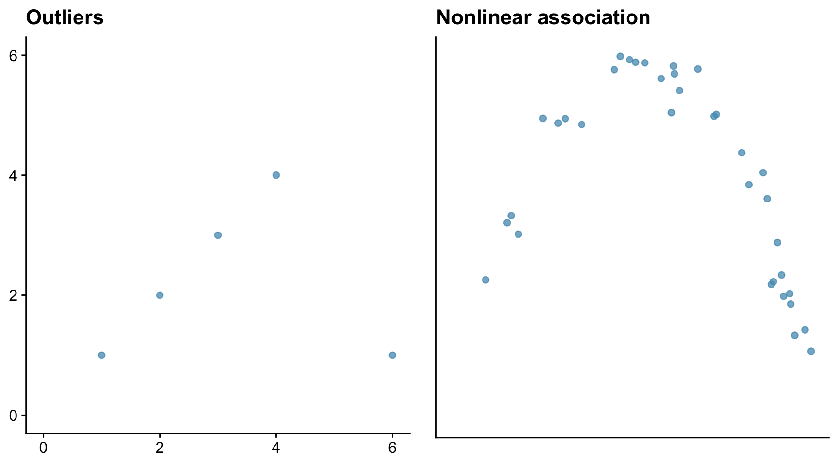 The outlier in the left-hand figure above brings the correlation coefficient down to 0.08, which is close to zero. The correlation coefficient in the right-hand figure is similarly small at -0.443, despite that there is a strong association between the x and y data. The reason is that the association is non-linear.