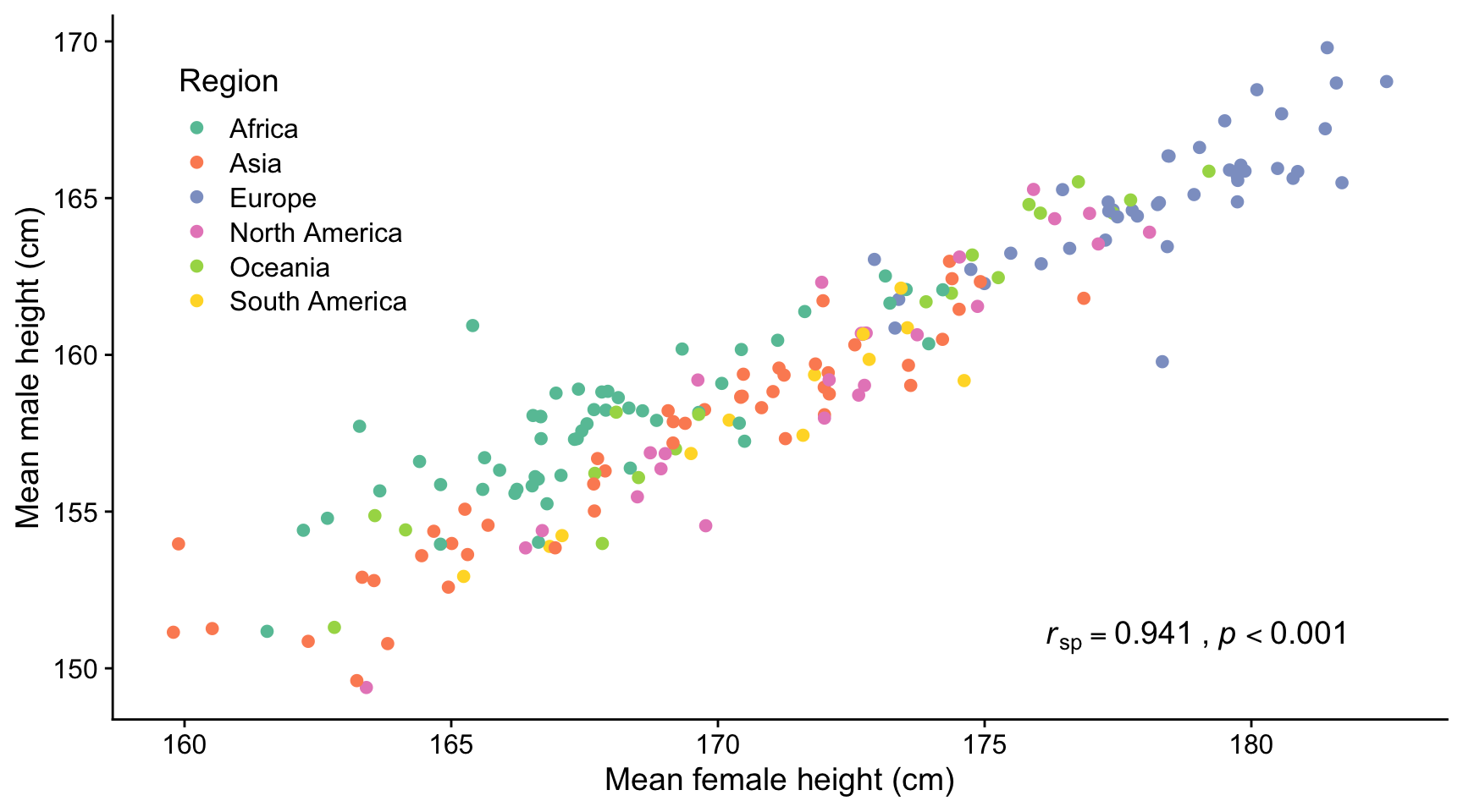 The figure below shows the mean heights of adult men vs adult women in many different countries who were born in 1996. There is a strong positive and linear correlation between these heights (rsp = 0.941, p < 0.001). The Spearman’s rank correlation coefficient is calculated because the male mean heights are not normally distributed among themselves.