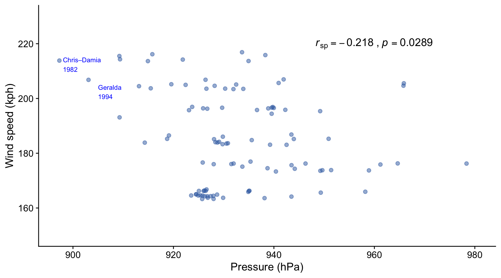 In this figure we see that there is a weak but significant negative correlation between the peak recorded wind speed and the minimum recorded pressure at the centre of intense tropical cyclones that occurred in the south west Indian Ocean between 1973 and 2024. Neither wind speed nor pressure were normally distributed, so the Spearman’s rank correlation coefficient rSp has been calculated, and not the Pearson r coefficient.