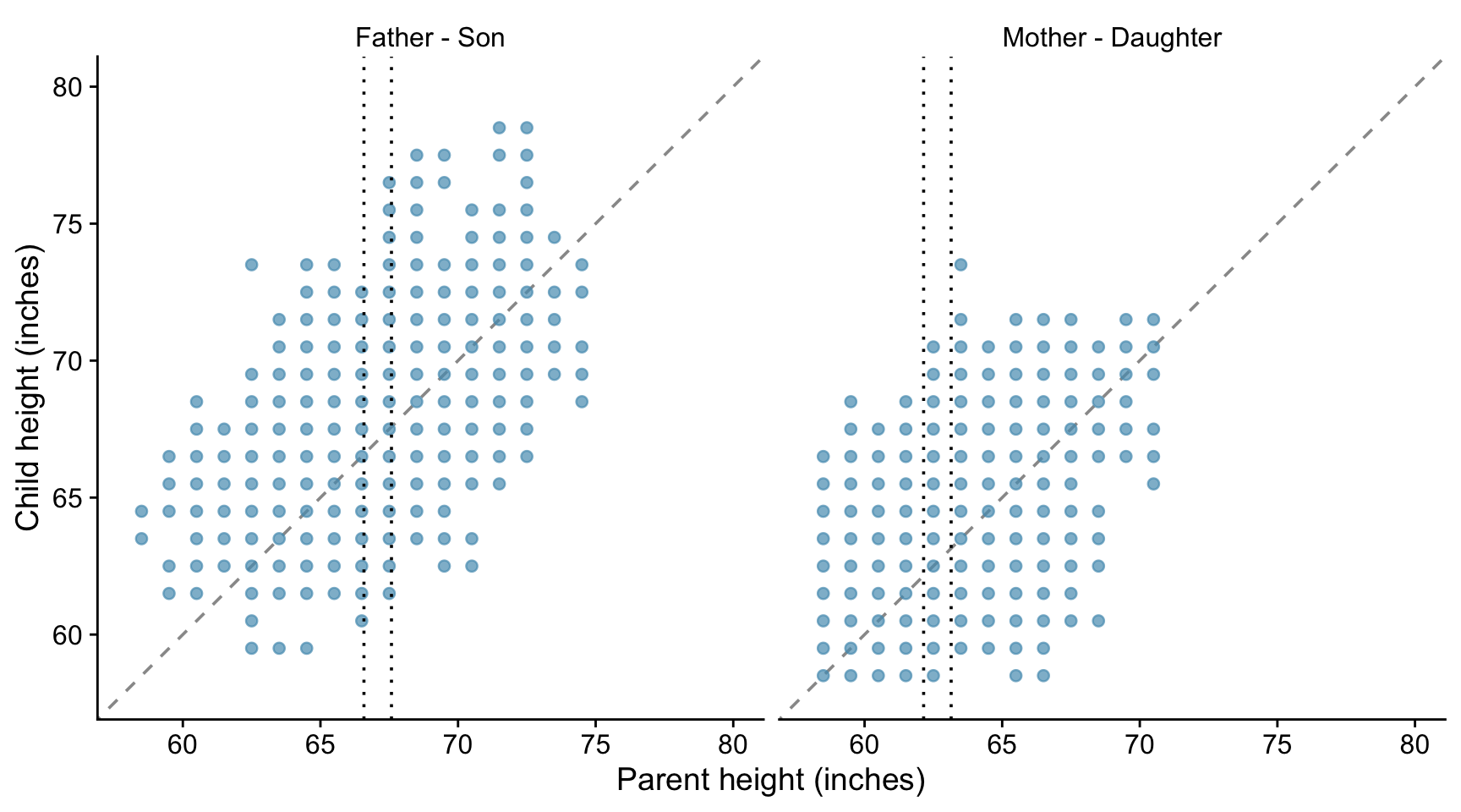 Consider fathers who are about about 67 inches tall, and look at the wide variation in the heights of their sons - - all the points between the two vertical dotted lines. The same is true for the daughters of motherss who are about 63 inches tall.