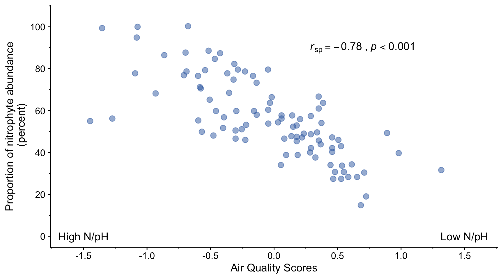 We note that the relationship between air quality score and proportion of nitrophyte abundance is plausibly linear.