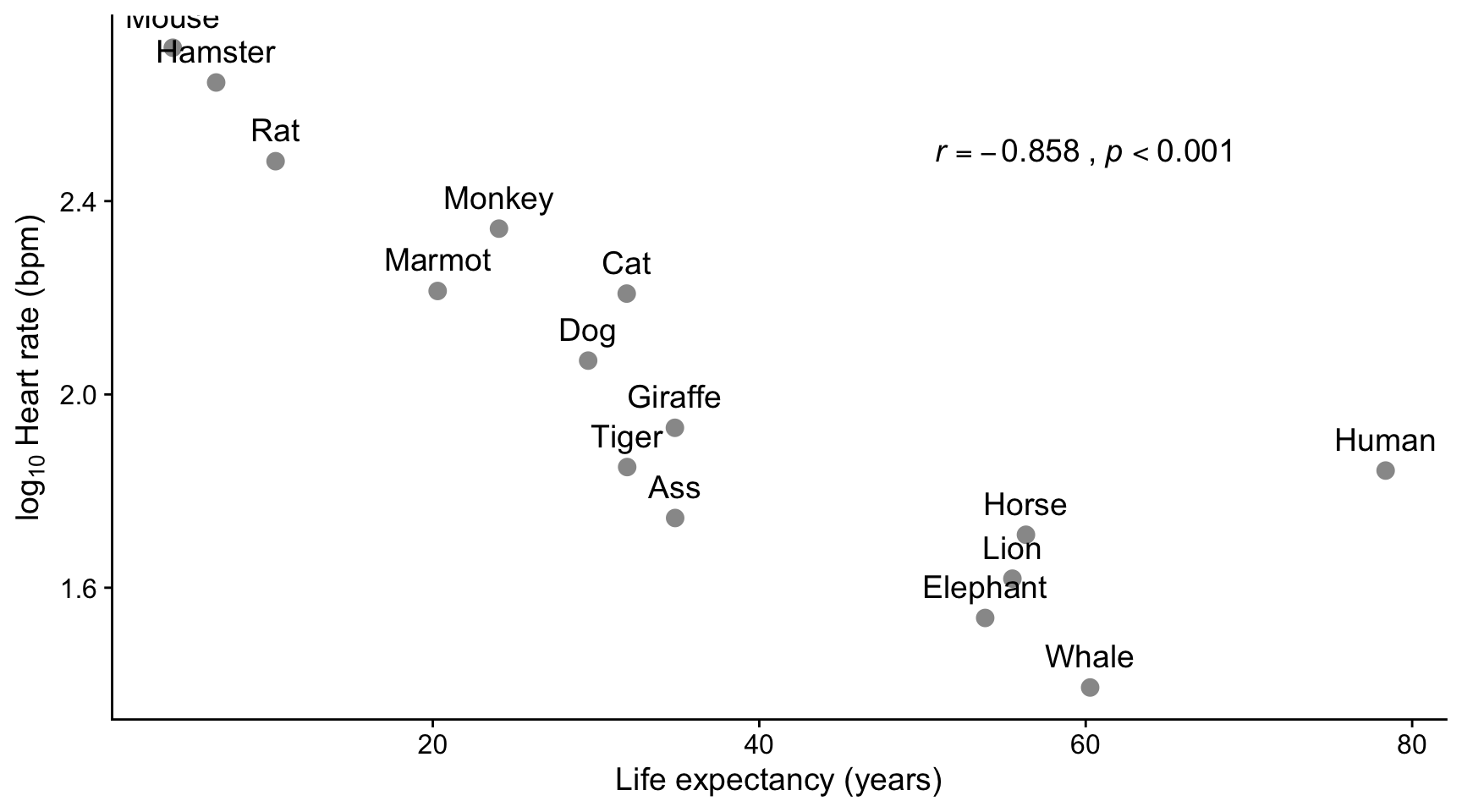 Here we see a strong negative linear correlation between the life expectancy of different species and the log of the mean heart rate in beats per minute. On this plot, humans are almost an outlier. In this case, use of a Shapiro-Wilk test showed that both life expectancy and log of the heart rate were found to be consistent with being drawn from normally distributed populations, so the Pearson method was used to calculate the correlation coefficient.