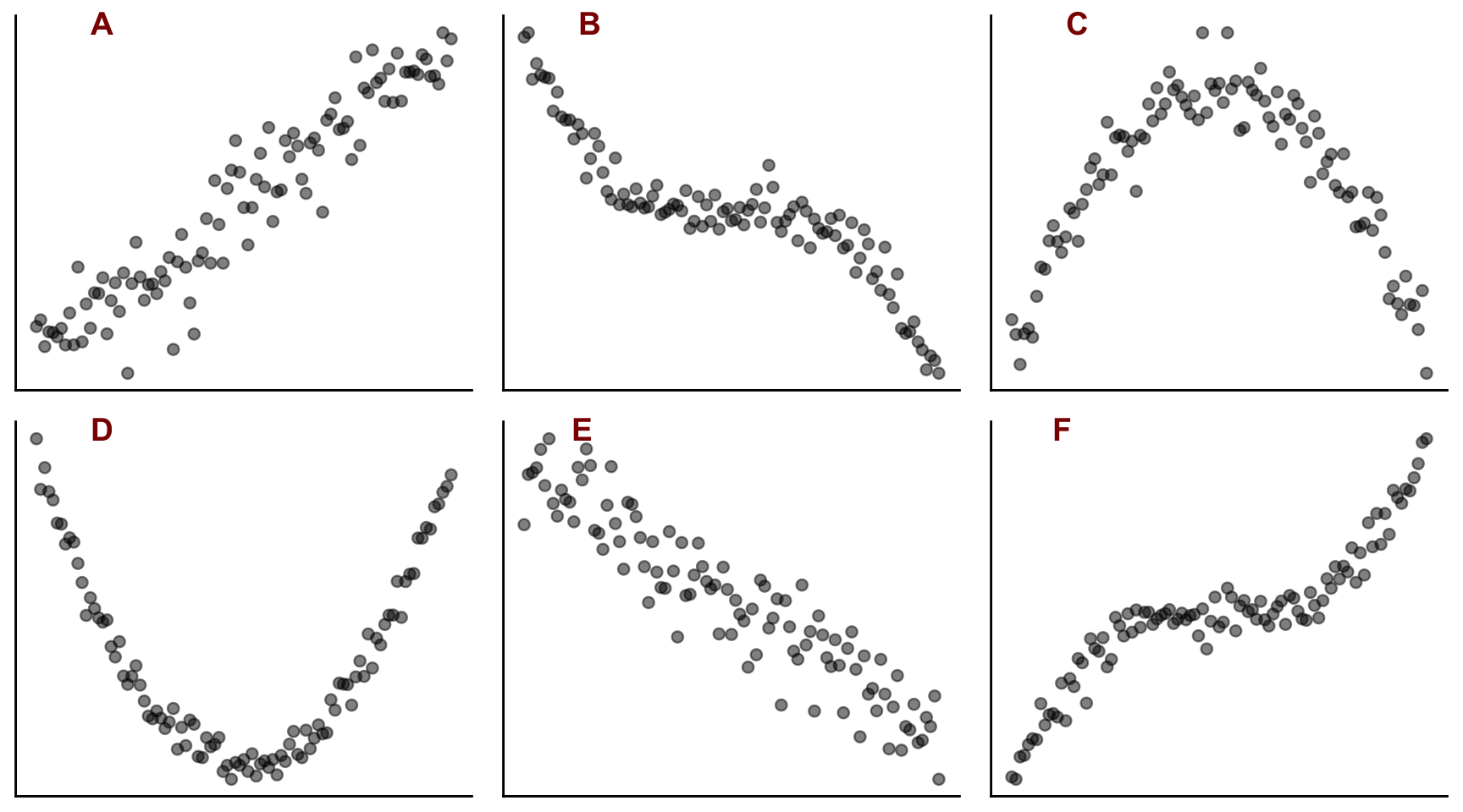 So, to sum up, we note that the Pearson correlation coefficient is a measure of linear association, not of association in general. At least, this is true if you are calculating the Pearson correlation coefficient. If your data are not suitable for that and you decide to calculate the Spearman’s Rank correlation coefficient, then the condition is relaxed somewhat: there might be but there no longer needs to be a linear relationship between the two variables, but there must at least be a monotonic one. That means that, as one variable increases, the other should either increase or remain constant, or decrease or remain constant. There should be no peaks or troughs in the data.