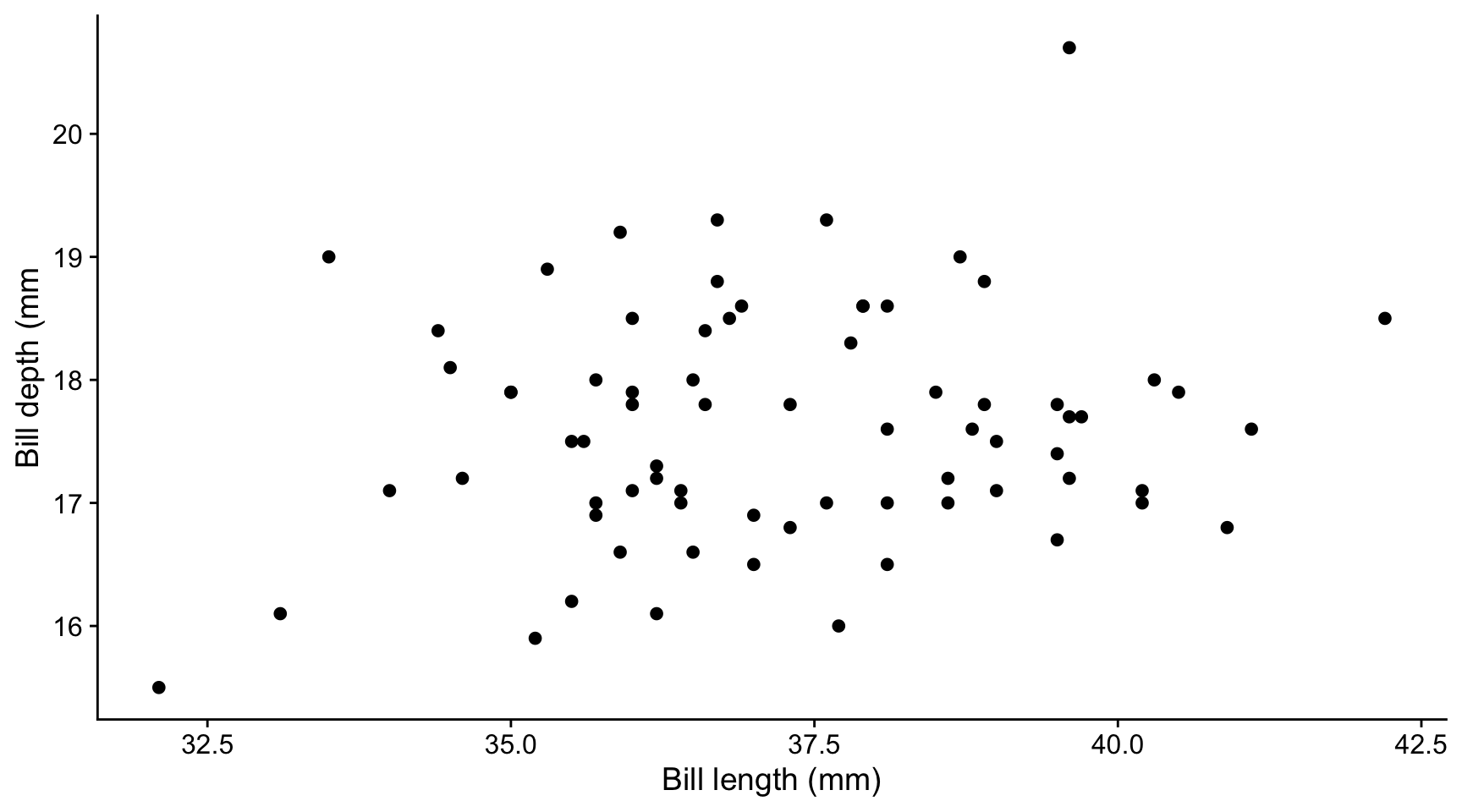 cor.test()function with the appropriate method argument (method = "pearson"ormethod = "spearman"), as appropriate, to determine if the bill length and bill depth variables are correlated. This means using an expression of the formcor.test(df$X, df$Y, method = "pearson")if you wanted to determine the Pearson correlation coefficient between theXandYcolumns of the data framedf.
