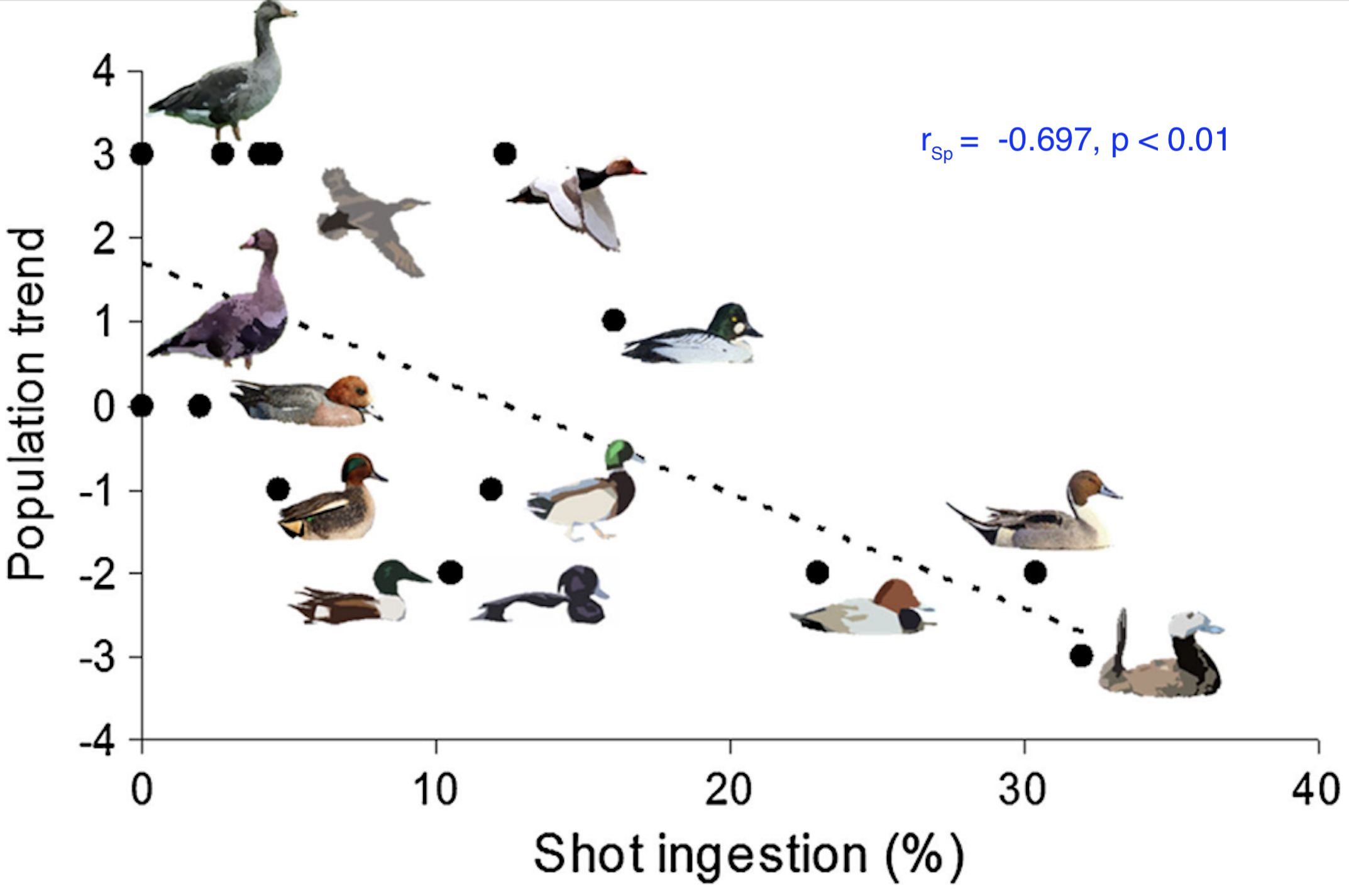 This figure is from a study by Pain et al (2019) on the impact on bird populations of ingestion of lead from spent lead ammunition arising from hunting using rifles and shot guns. For several species of wetland birds, the population trend (as measured by a proxy scale) is plotted against the prevalence of carcasses found to contain lead shot.