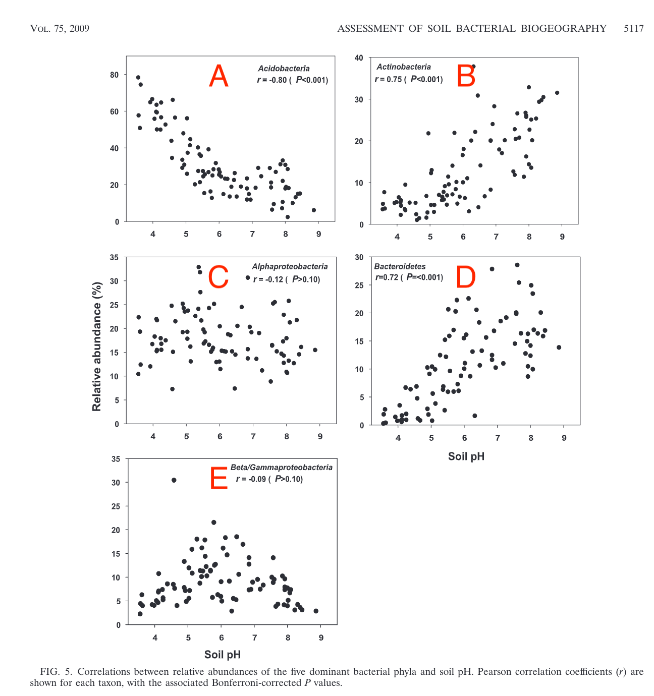 Here we look at figures published in a paper by Lauber and co-workers (2009) in which they investigate the evidence for an association between soil pH and the abundance of various species of bacteria.