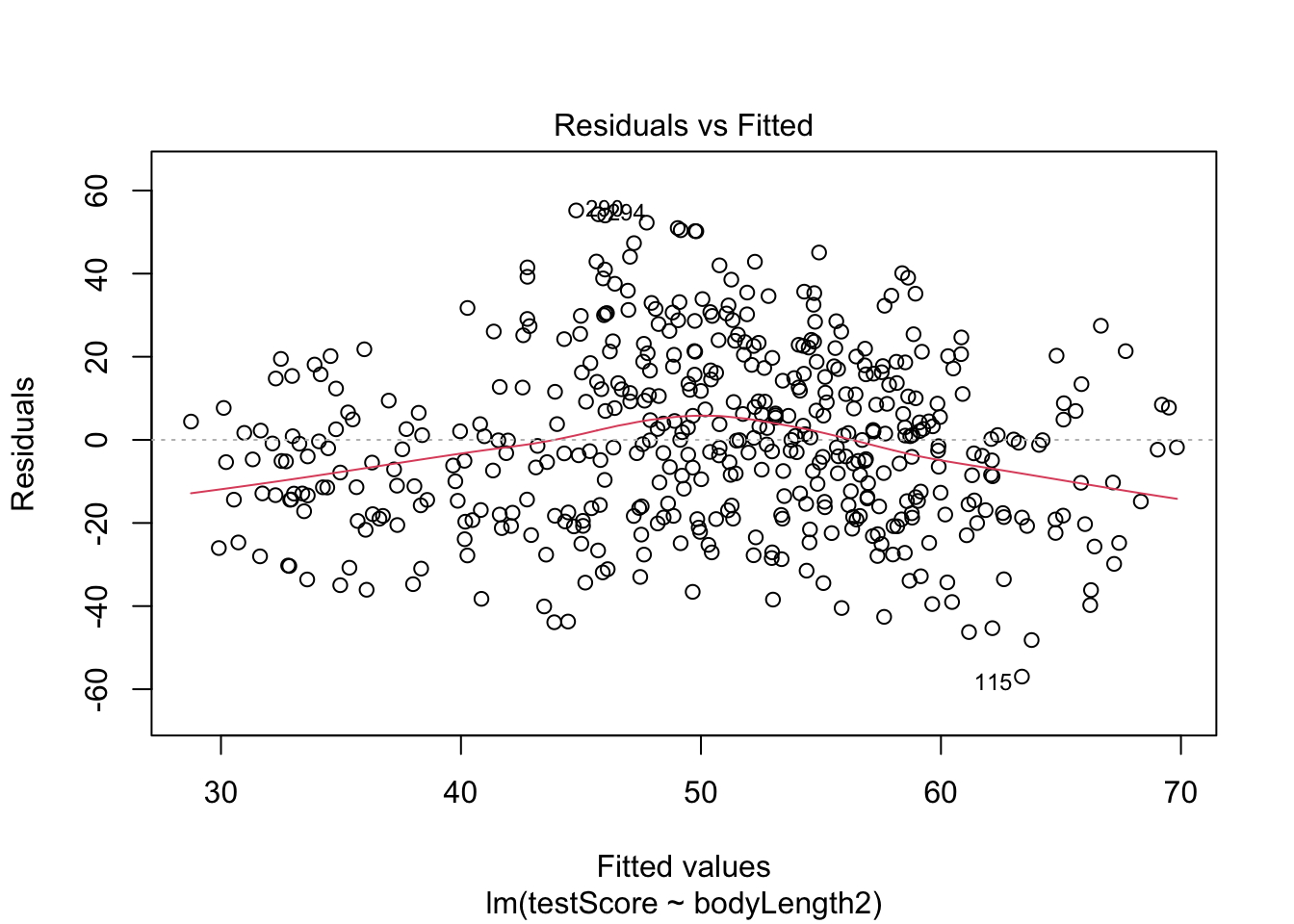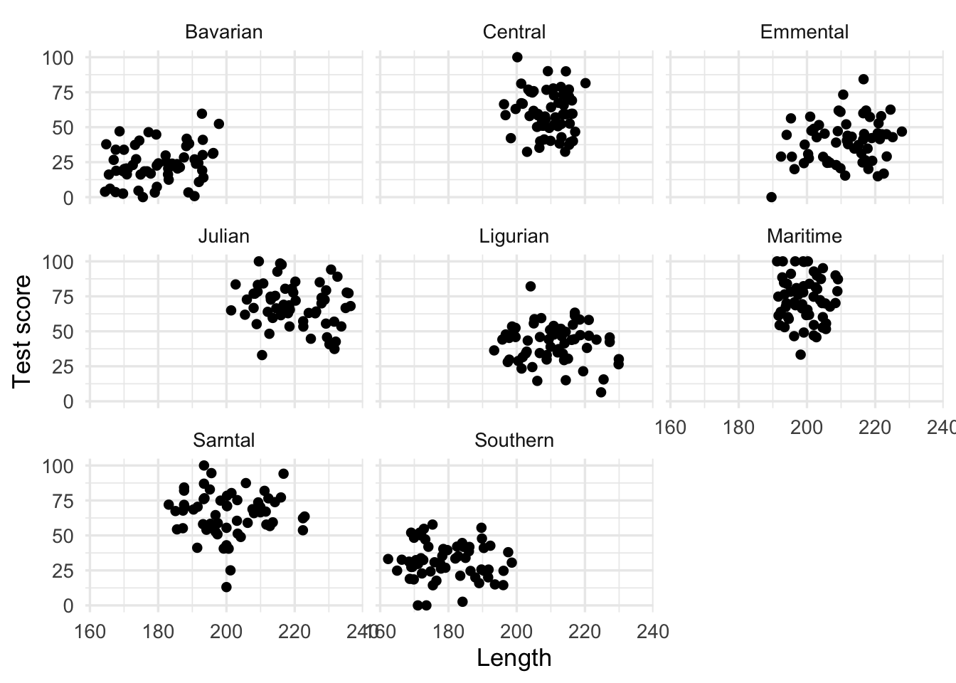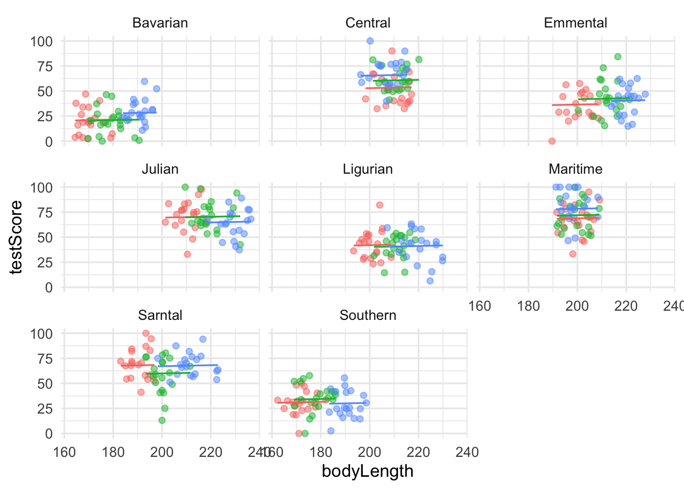 Now body length is not significant. But let’s think about what we are doing here for a second. The above model is estimating the difference in test scores between the mountain ranges - we can see all of them in the model output returned by summary(). But we are not interested in that, we just want to know whether body length affects test scores and we want to simply control for the variation coming from mountain ranges.