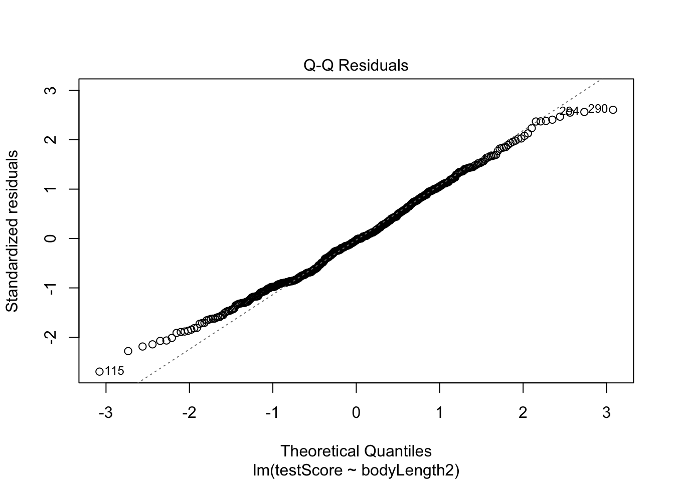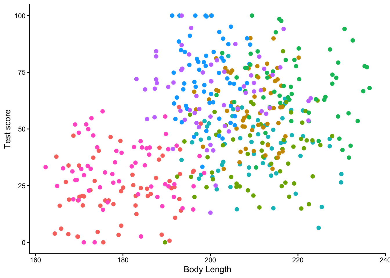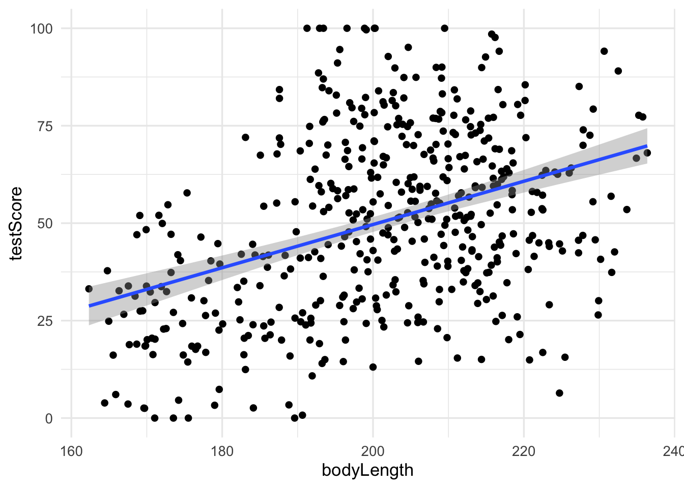mutate(bodyLength2 = (bodyLength - mean(bodyLength))/sd(bodyLength))Back to our question: is test score affected by body length?